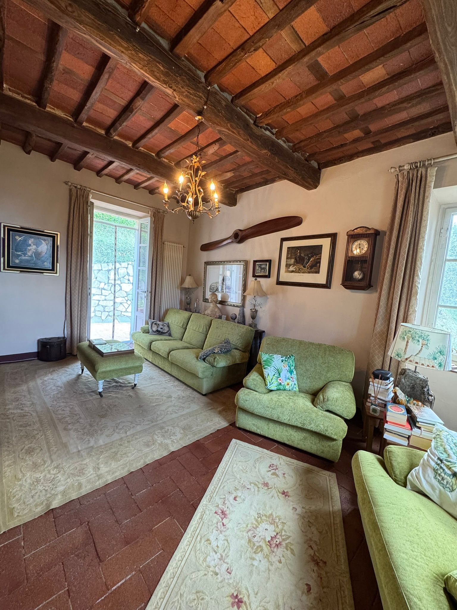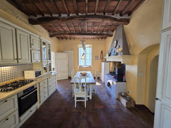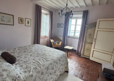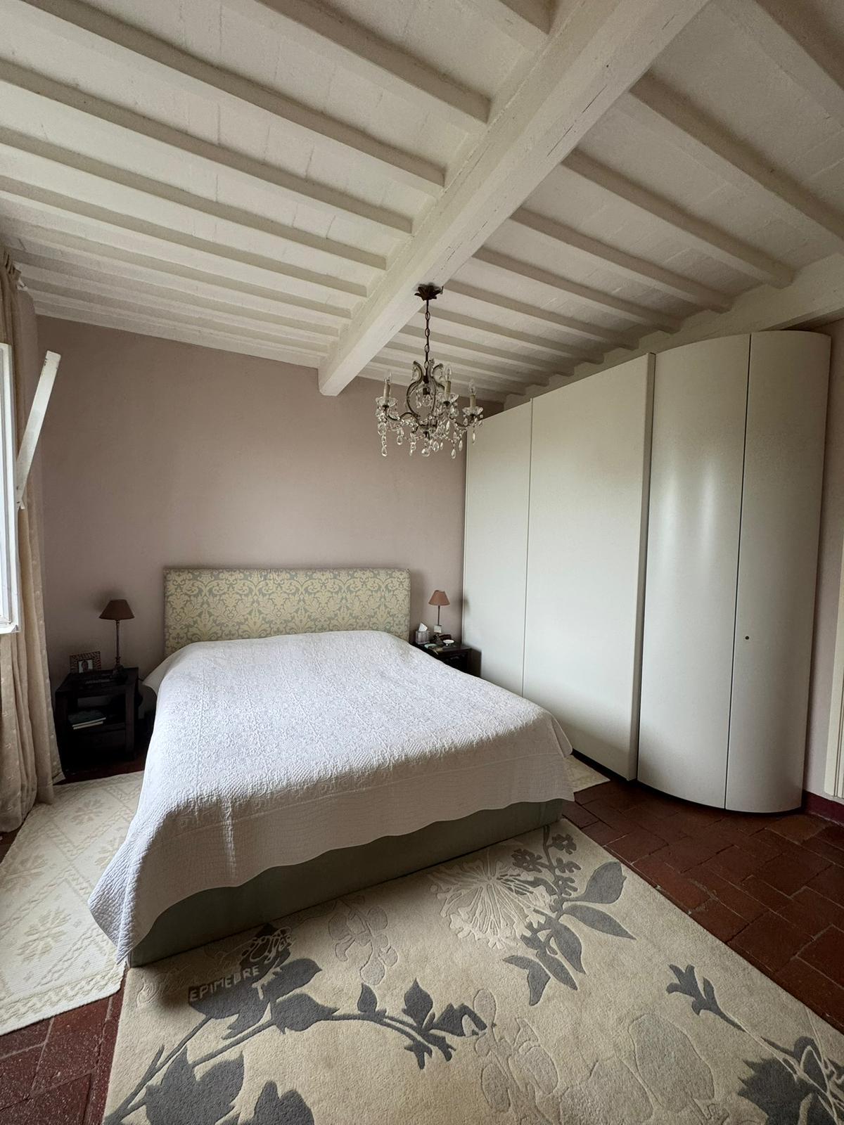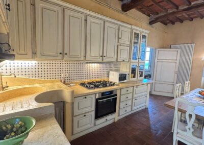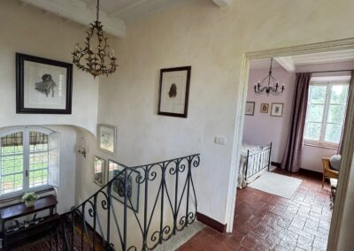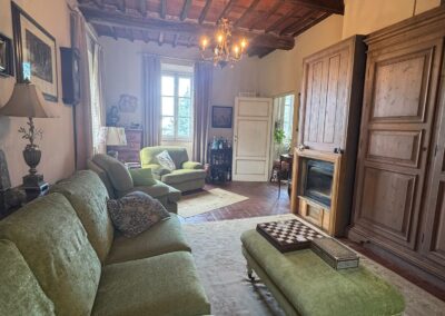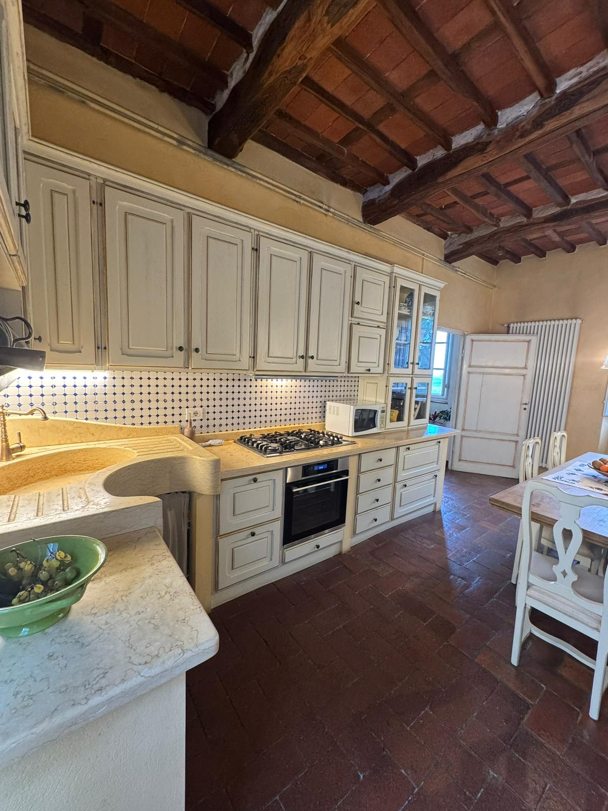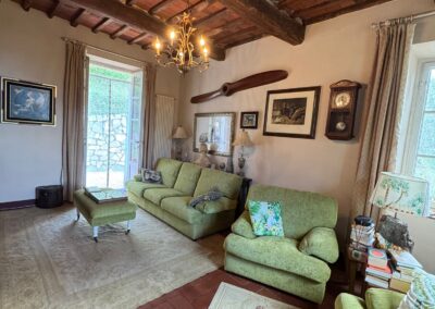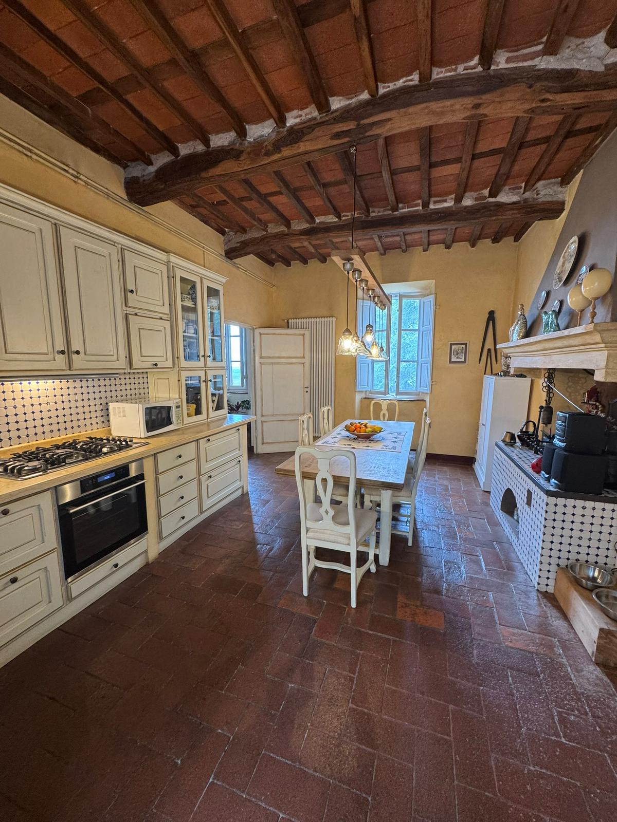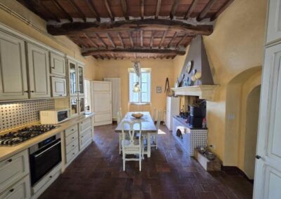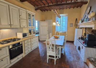 Completely renovated in the early 2000s, the property has beautifully preserved its authentic Tuscan character, featuring exposed wooden beams, terracotta floors, stone details, and elegant green Cipollino marble staircases.
