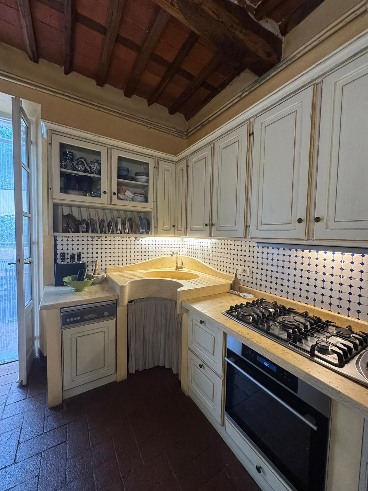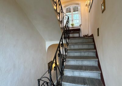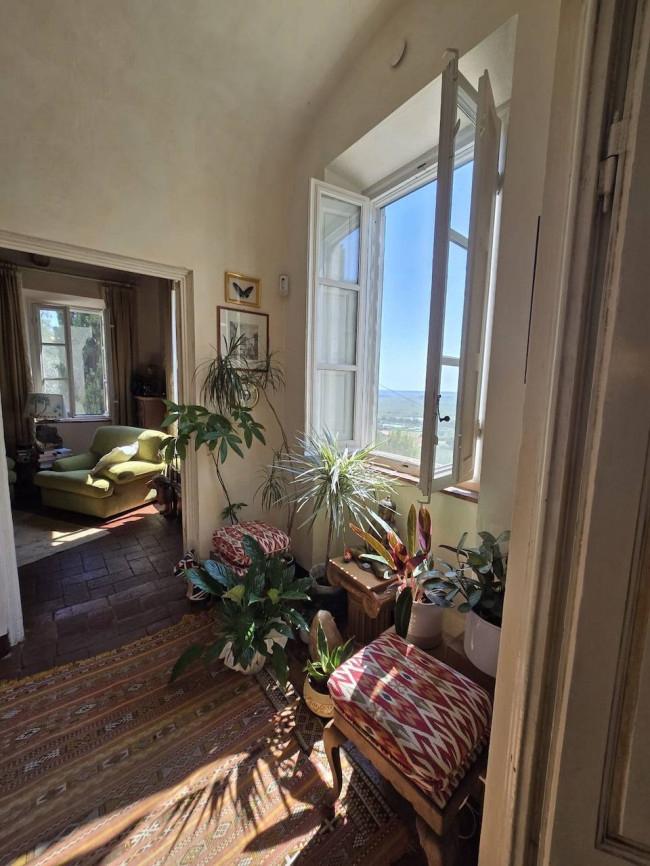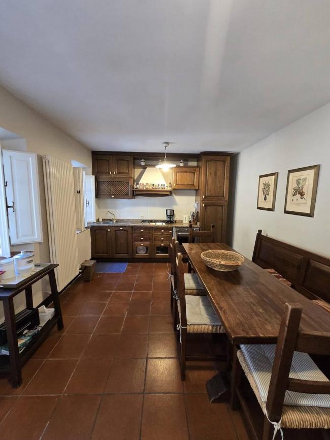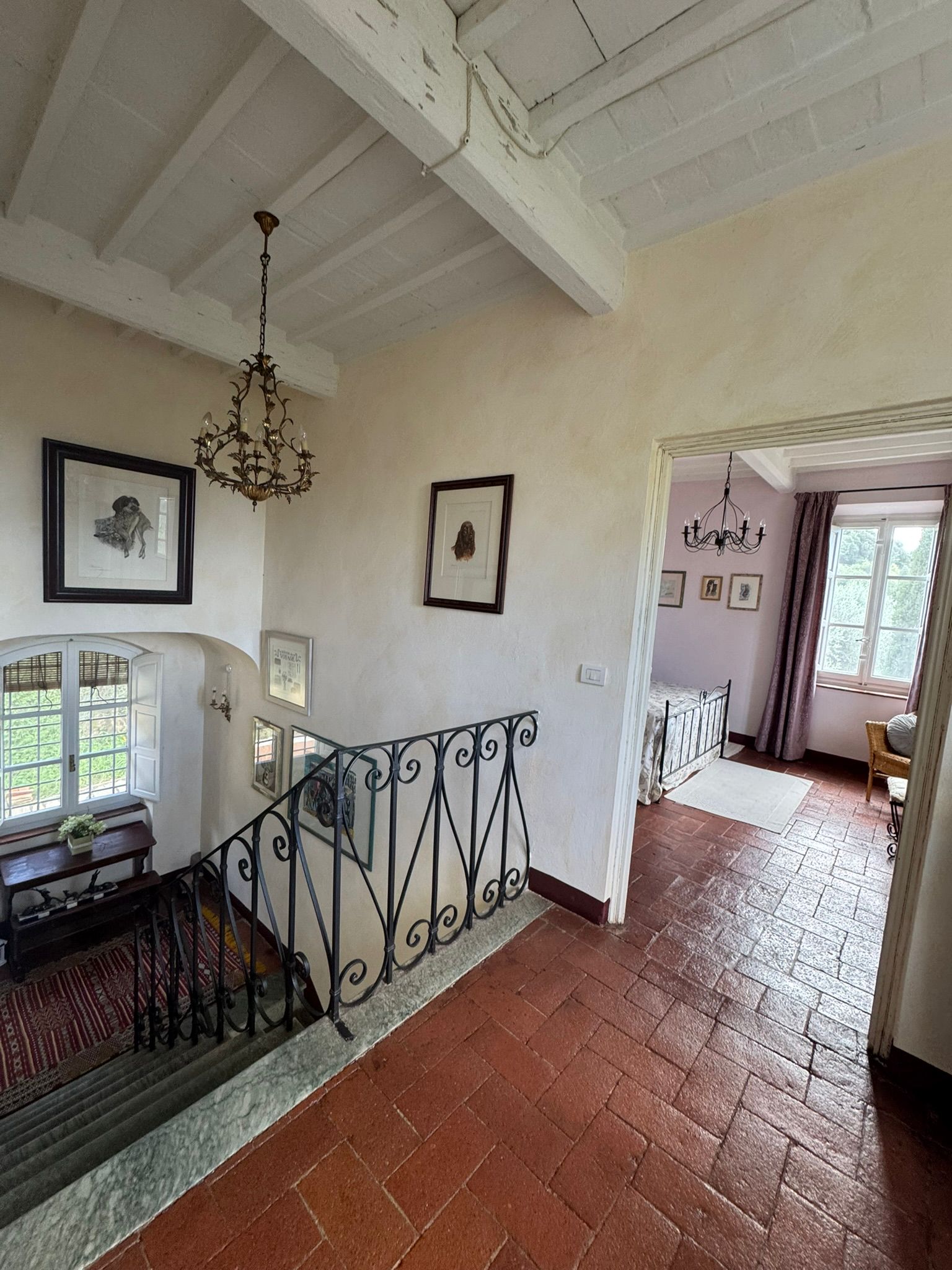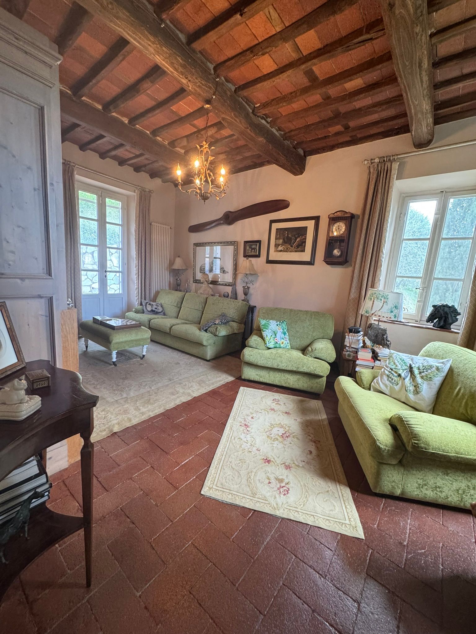Completely renovated in the early 2000s, the property has beautifully preserved its authentic Tuscan character, featuring exposed wooden beams, terracotta floors, stone details, and elegant green Cipollino marble staircases.