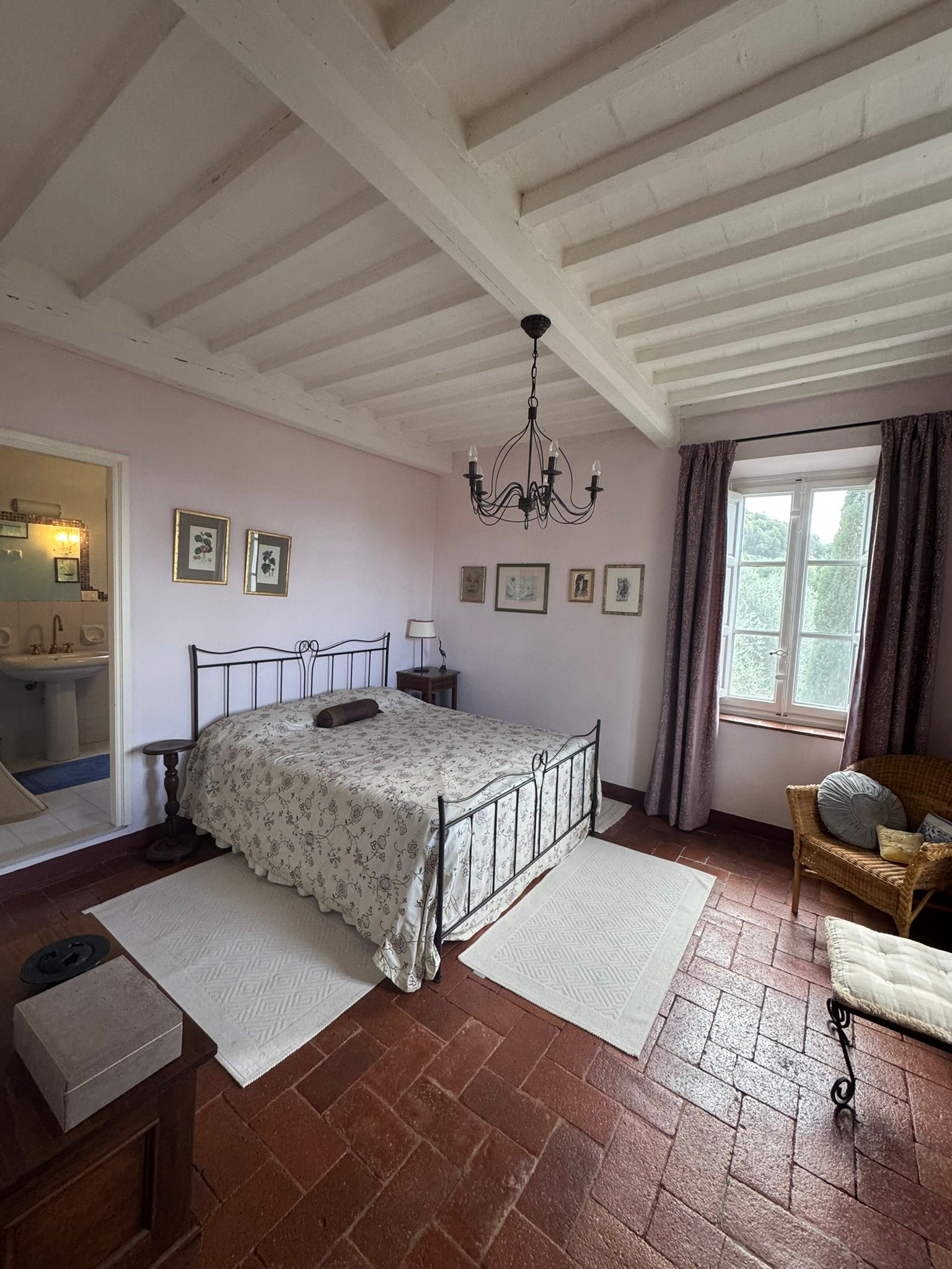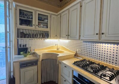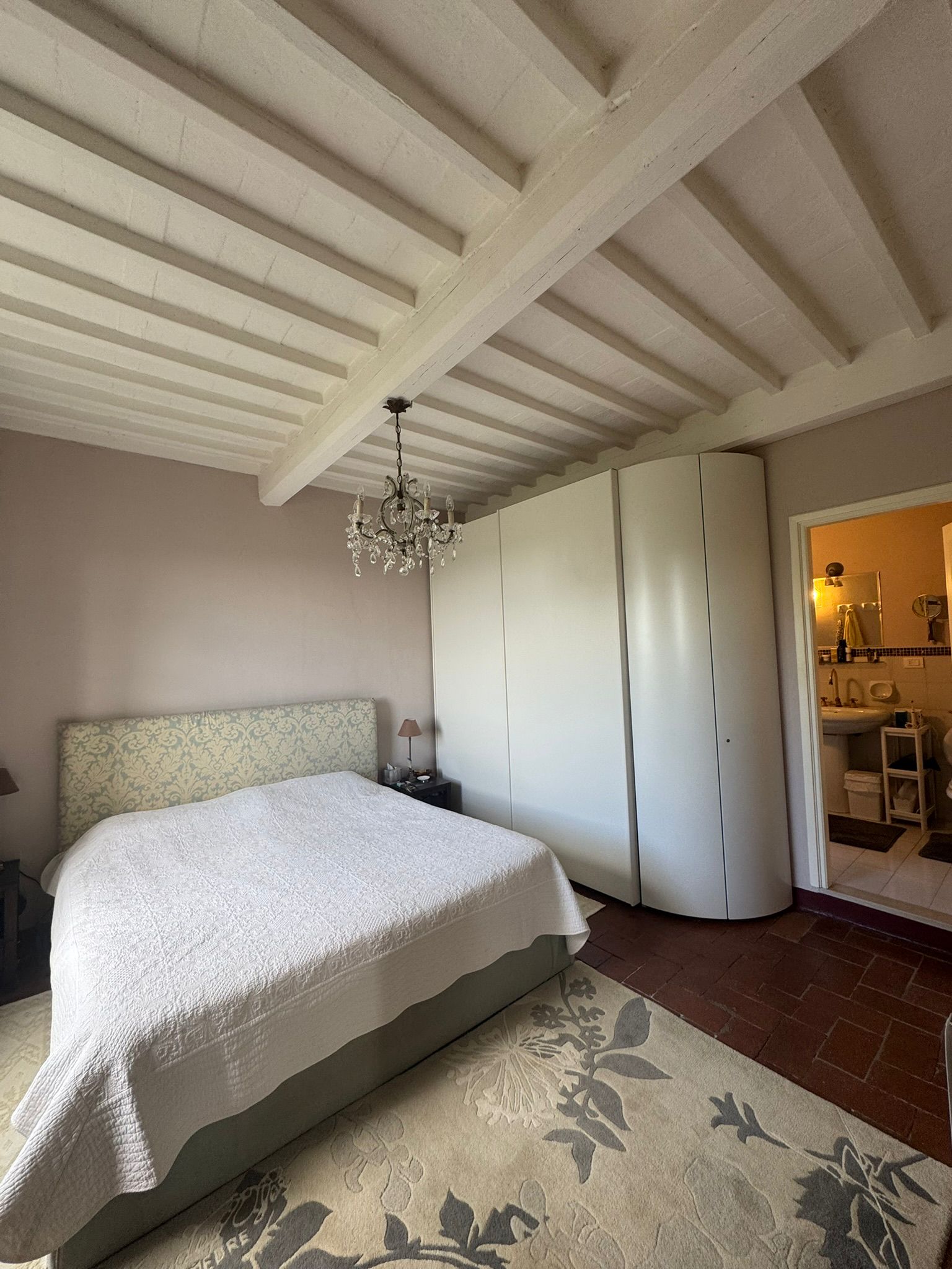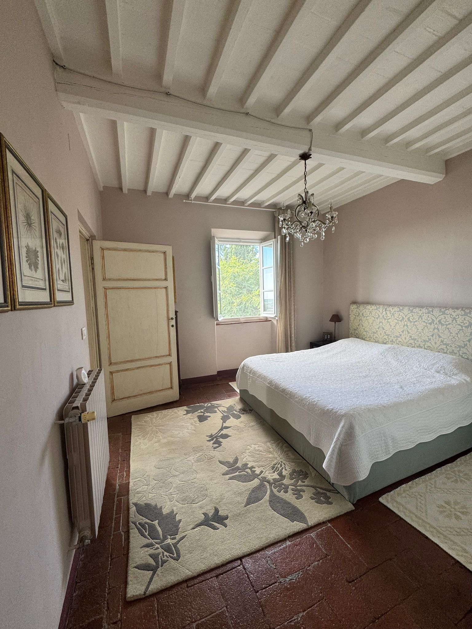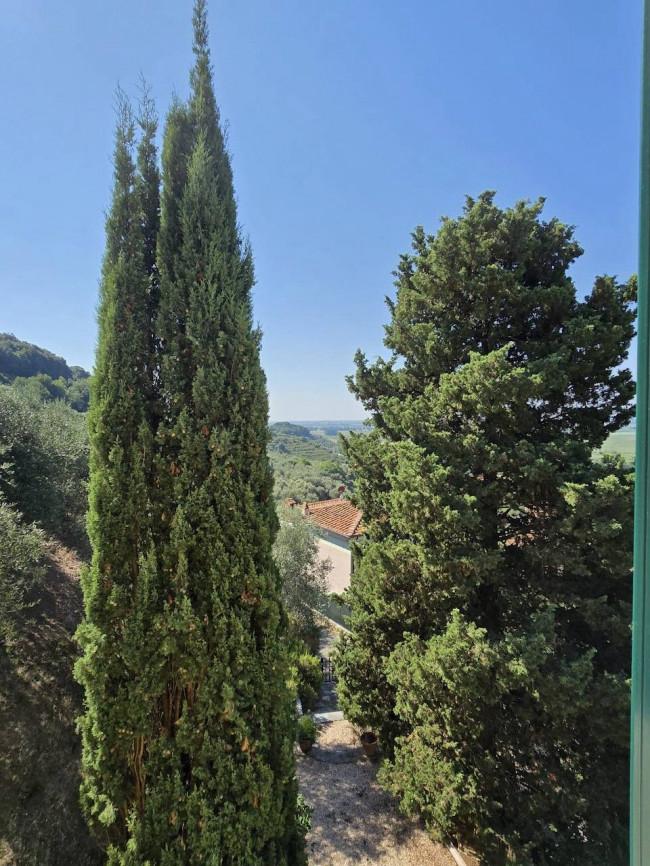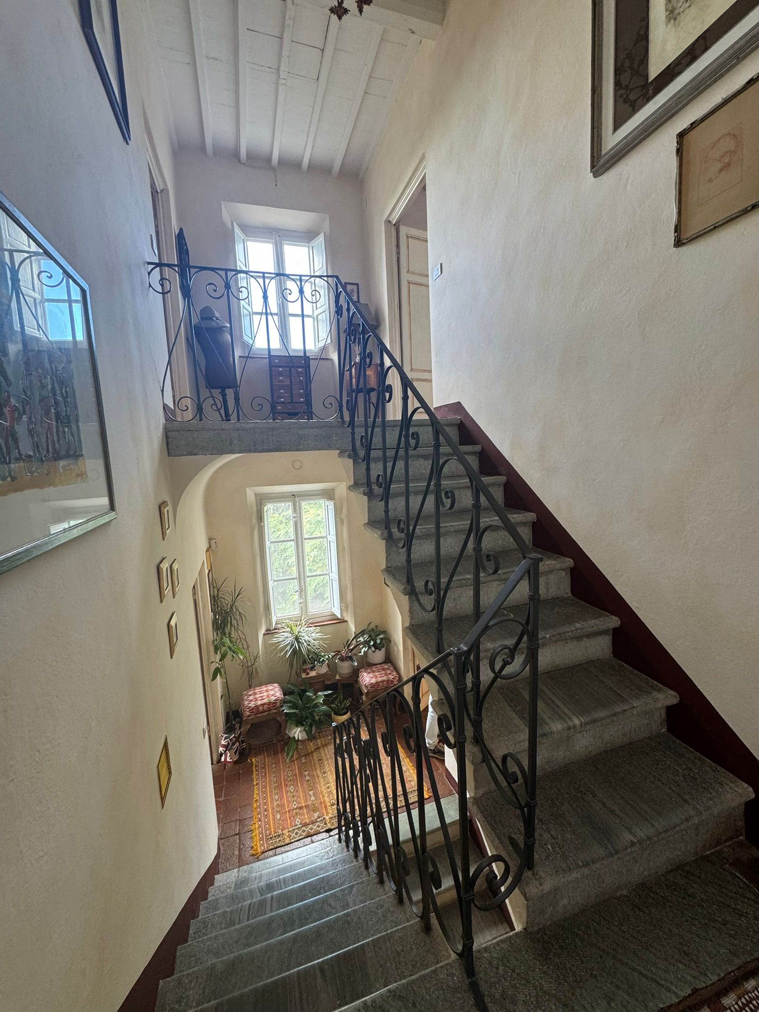 Completely renovated in the early 2000s, the property has beautifully preserved its authentic Tuscan character, featuring exposed wooden beams, terracotta floors, stone details, and elegant green Cipollino marble staircases.