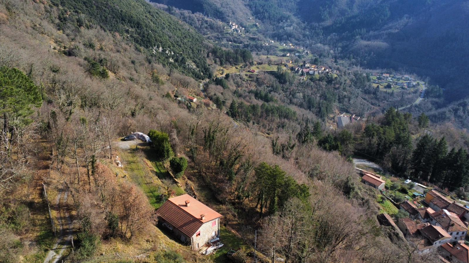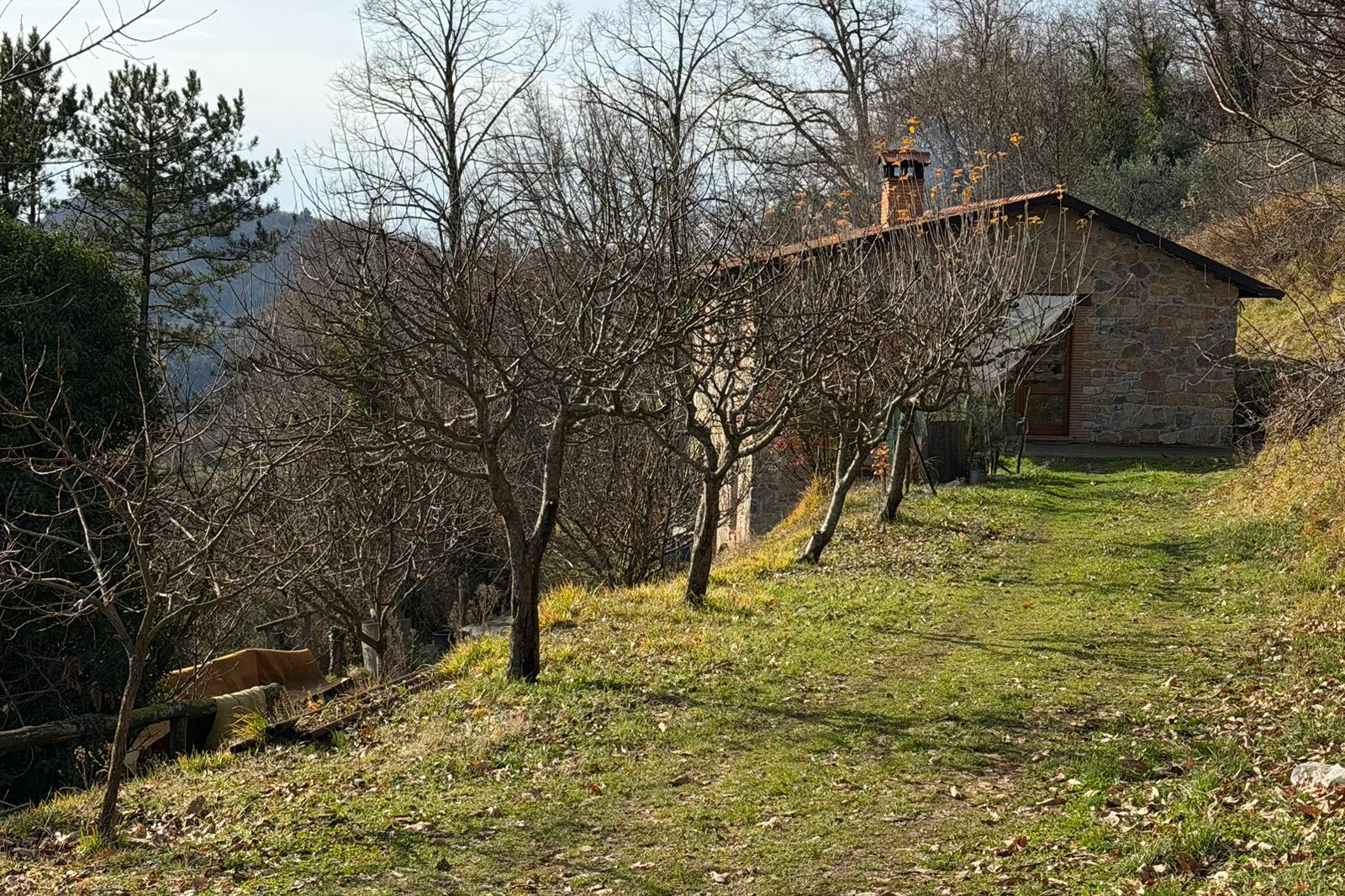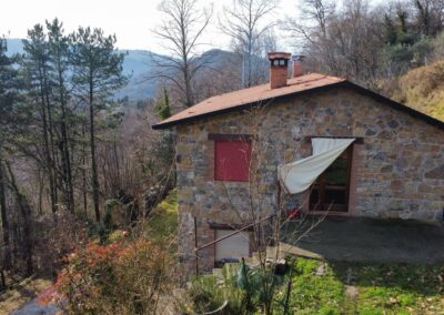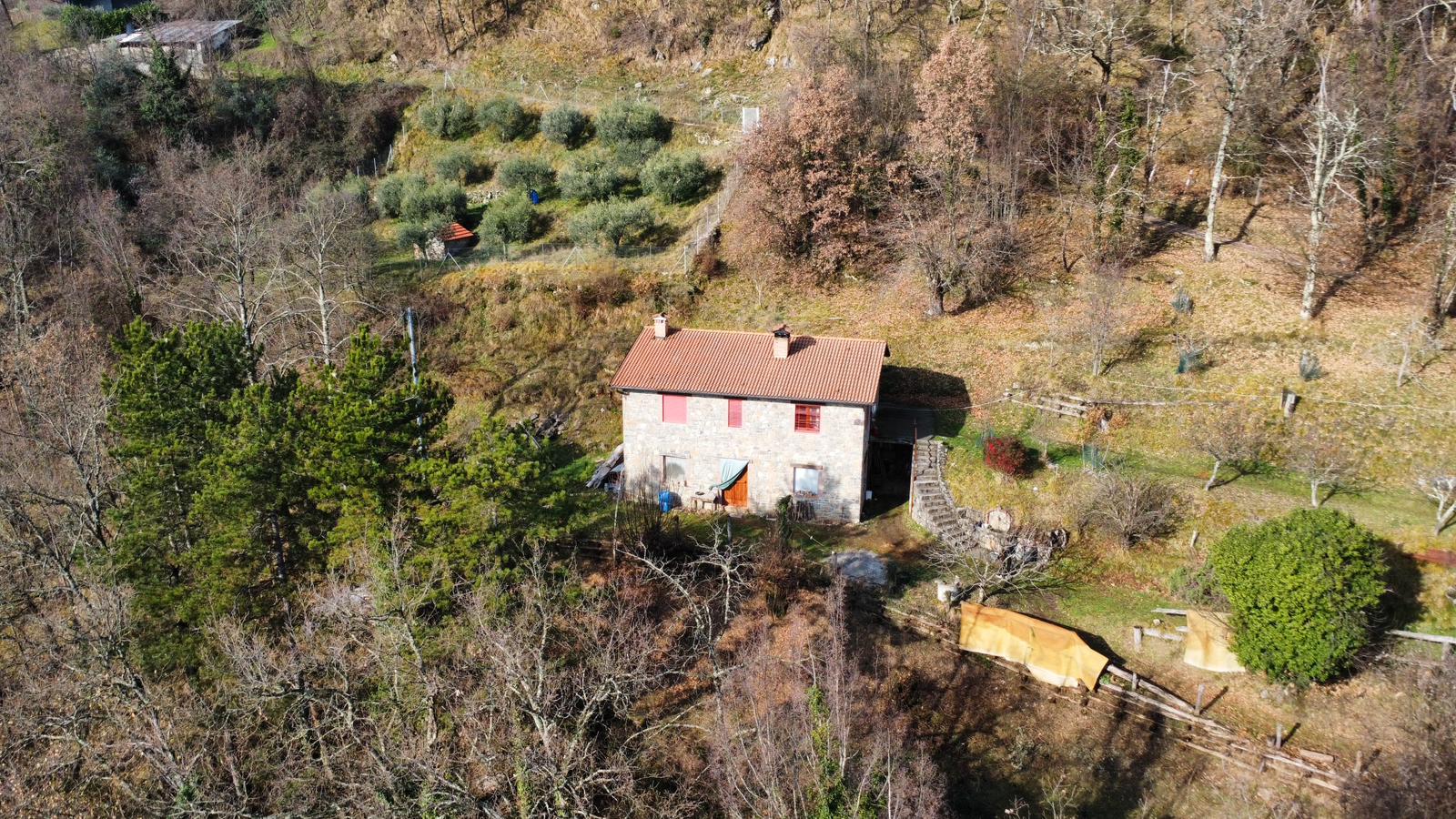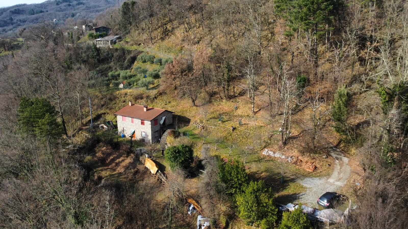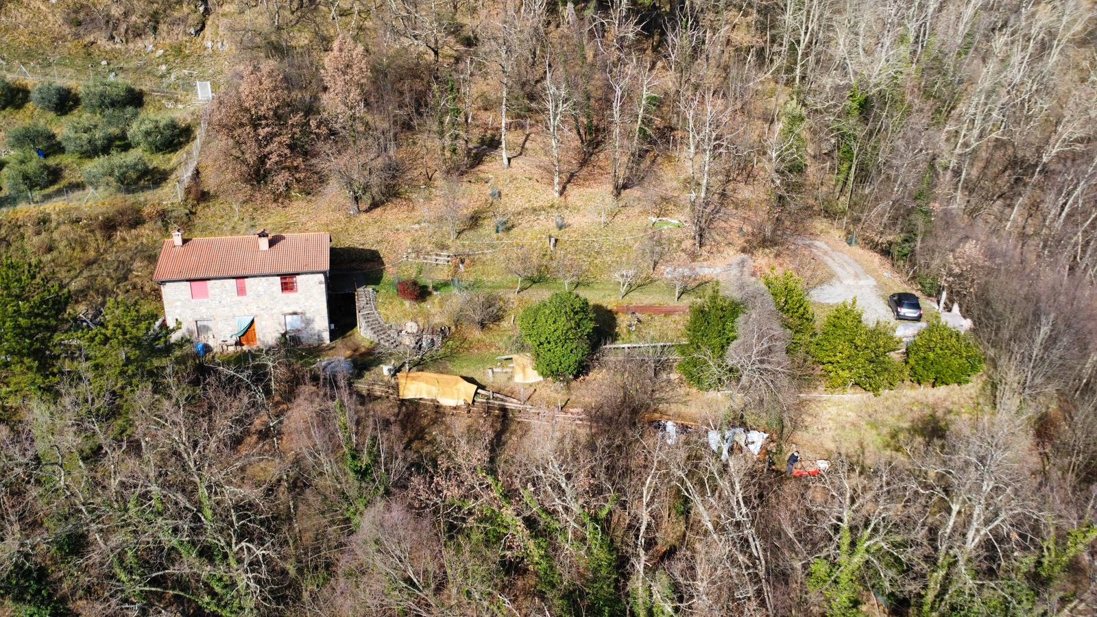 For sale: a charming independent house with over 4,000 sqm of terraced land, fully fenced with posts and wire, set in a quiet and secluded natural environment. The property is reached via a well-maintained gravel road; the final stretch, within the property, gently slopes through a chestnut woodland and becomes flat near the house, offering ample parking space.