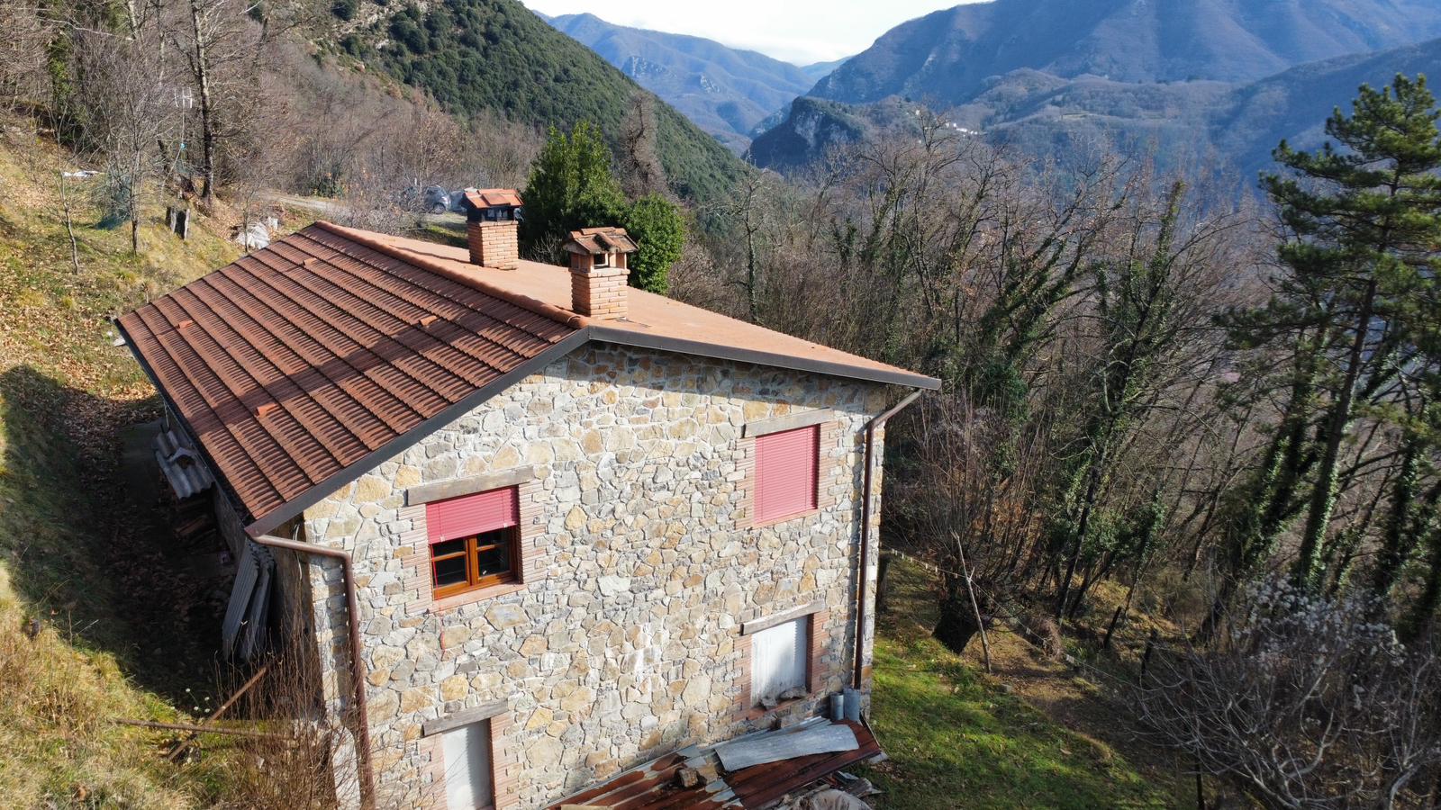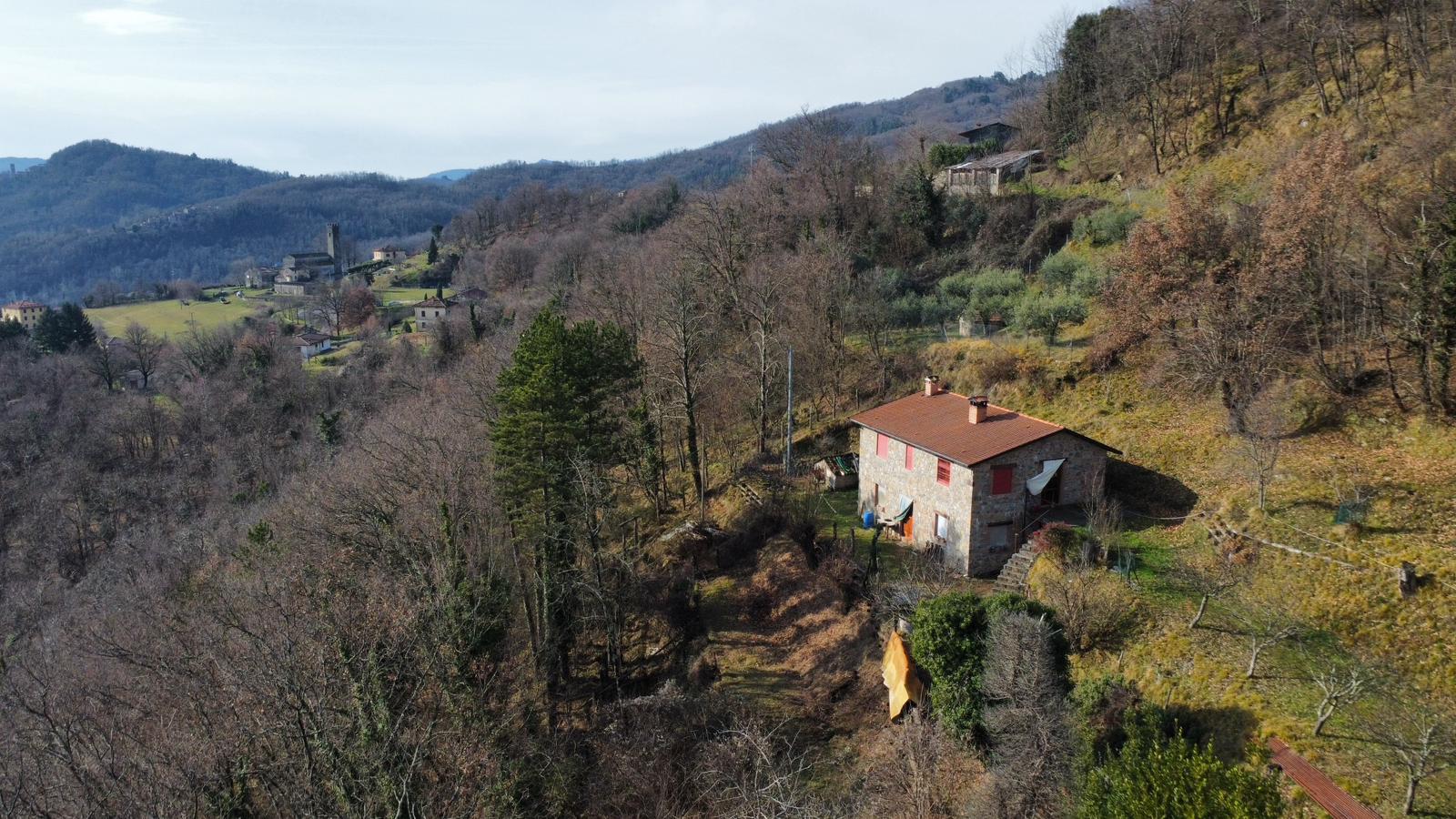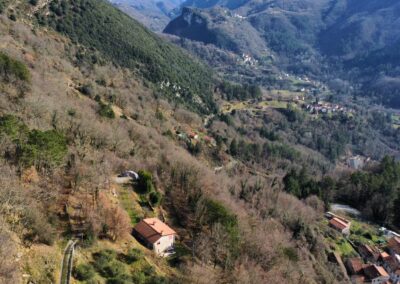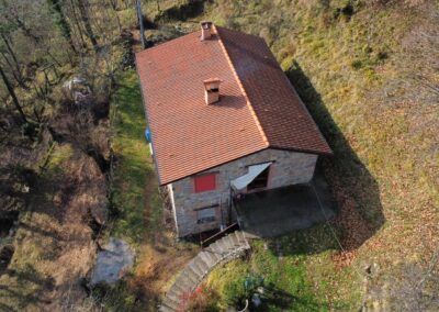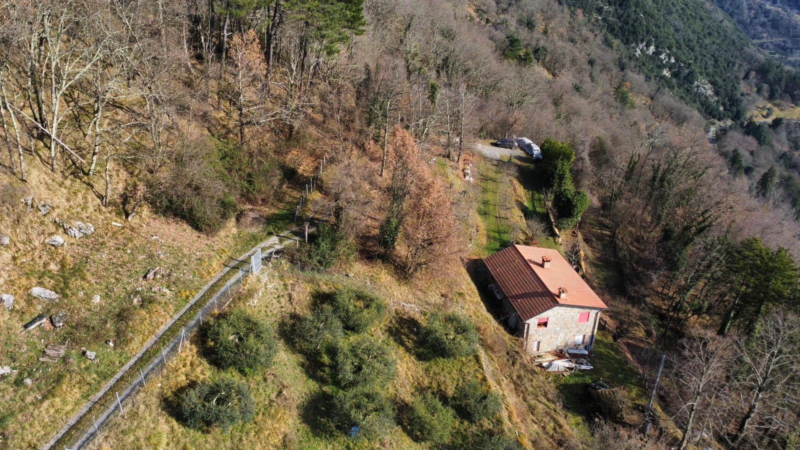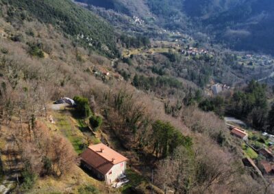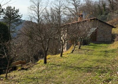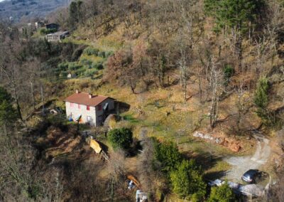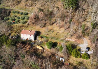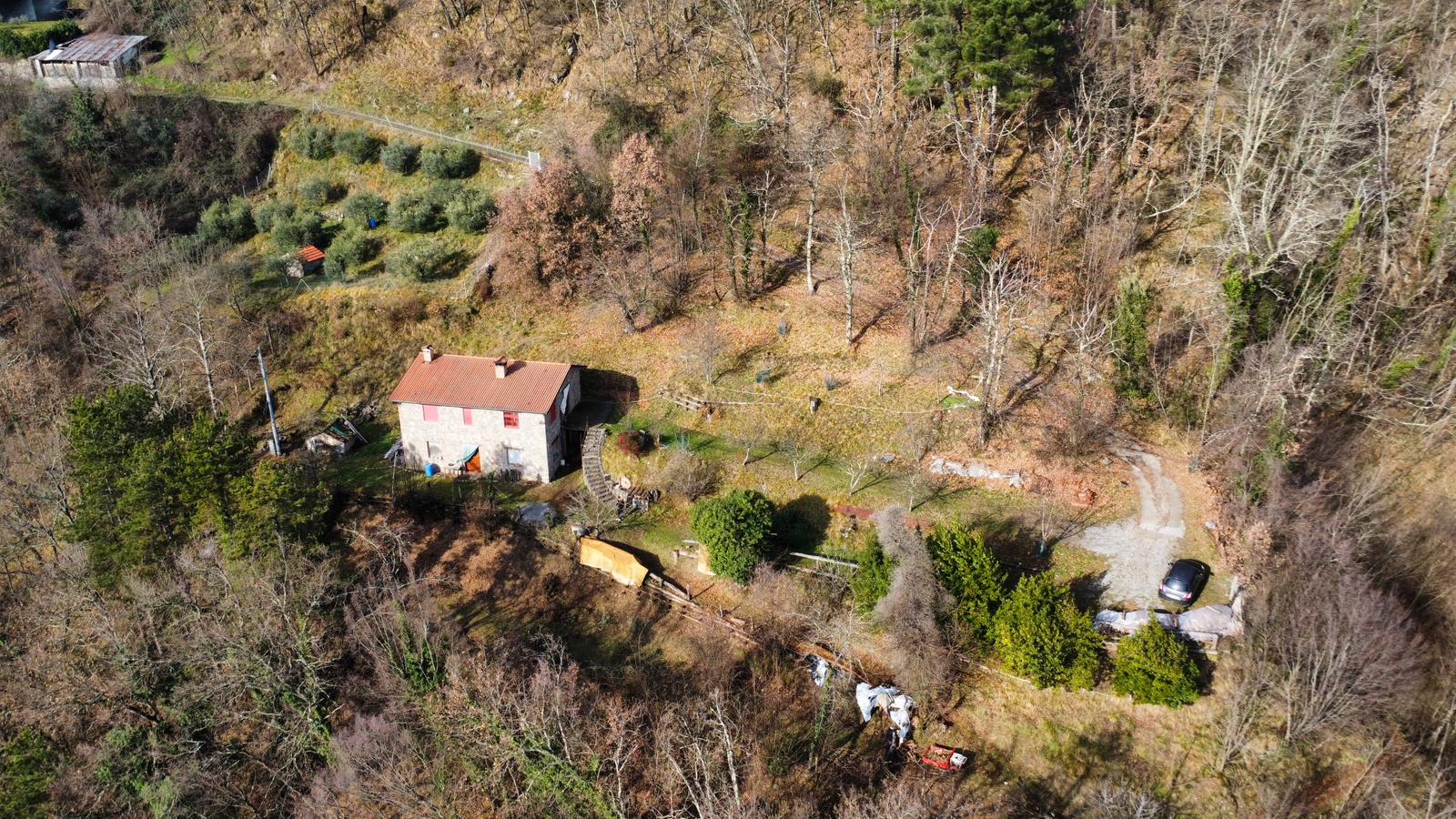 For sale: a charming independent house with over 4,000 sqm of terraced land, fully fenced with posts and wire, set in a quiet and secluded natural environment. The property is reached via a well-maintained gravel road; the final stretch, within the property, gently slopes through a chestnut woodland and becomes flat near the house, offering ample parking space.