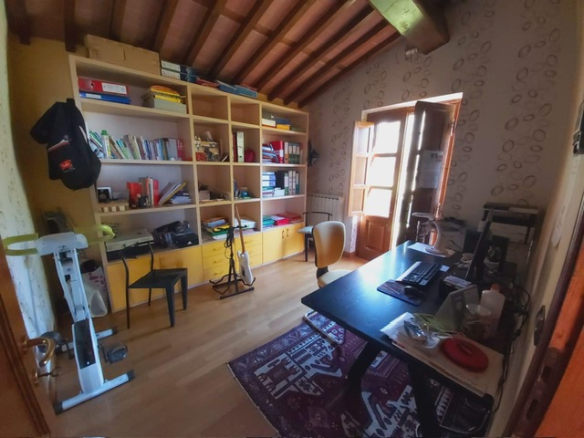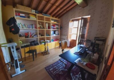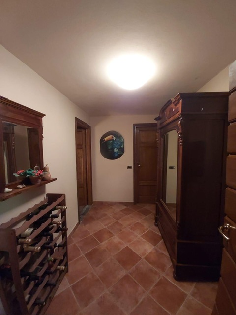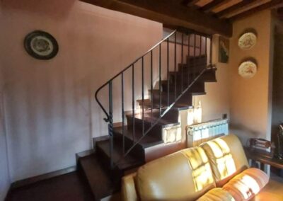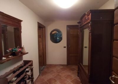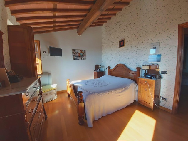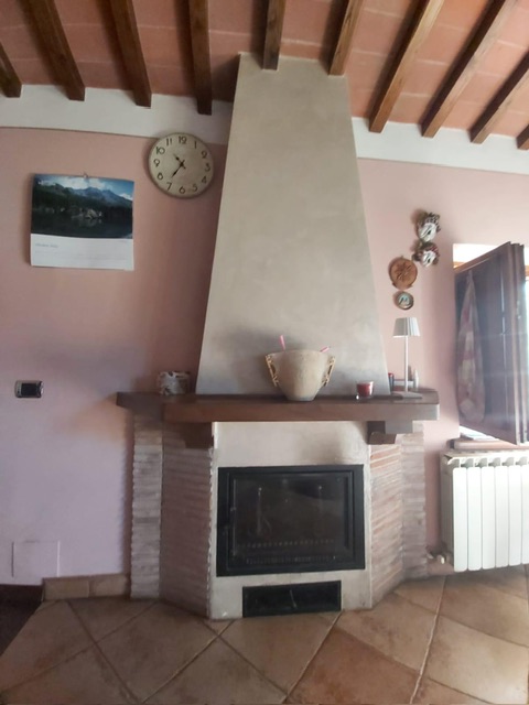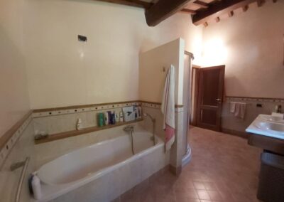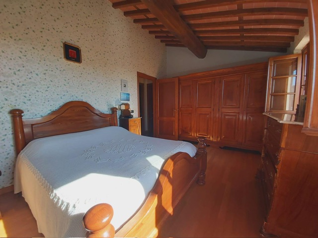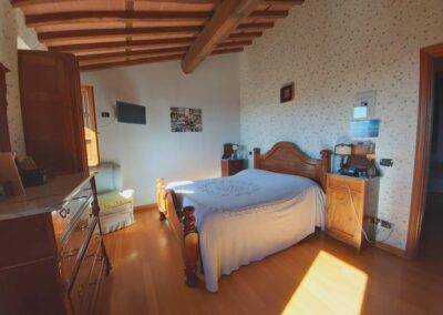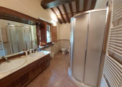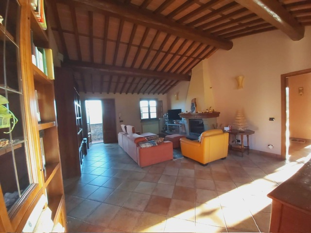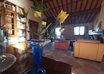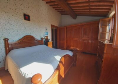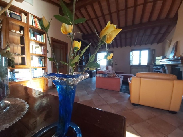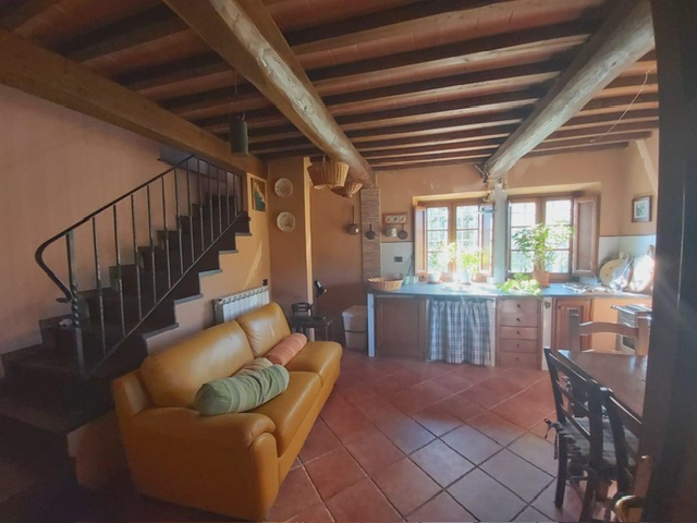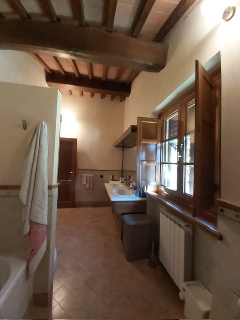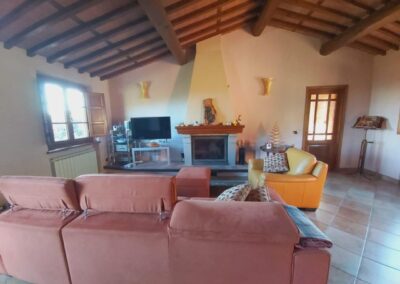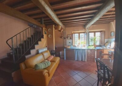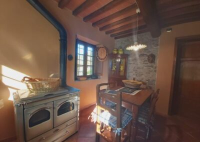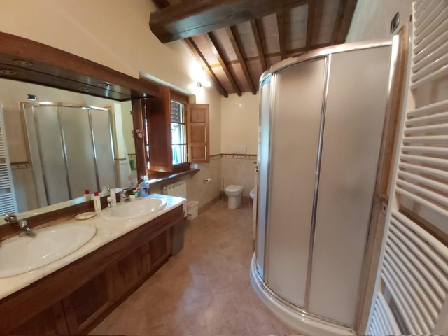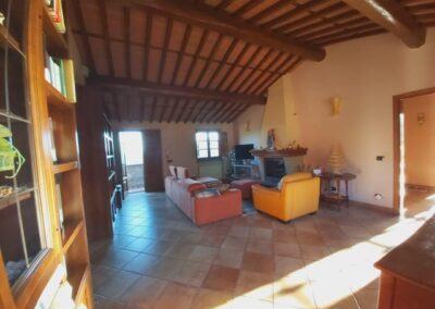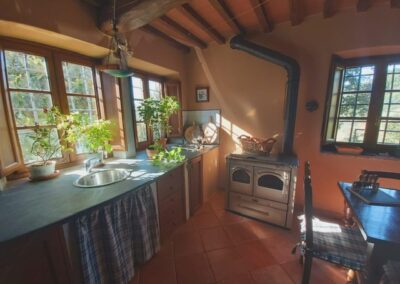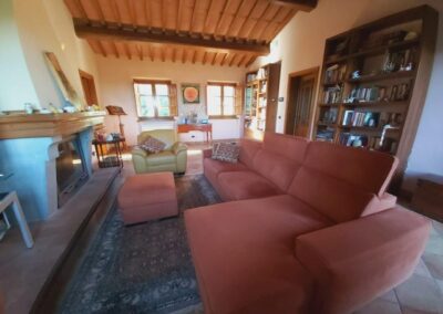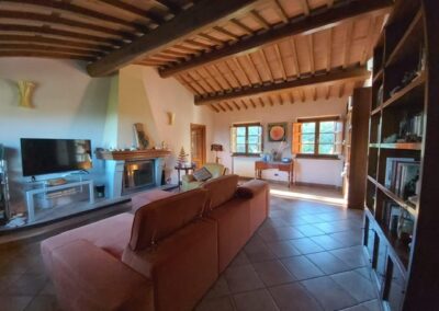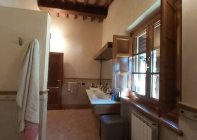 The farmhouse, arranged over two floors, has been the subject of a meticulous restoration that highlights traditional Tuscan craftsmanship — Matraia stone walls, antique terracotta tiles, exposed wooden beams, and solid wood double-glazed windows. Every detail has been thoughtfully designed to combine rustic authenticity with elegant functionality.